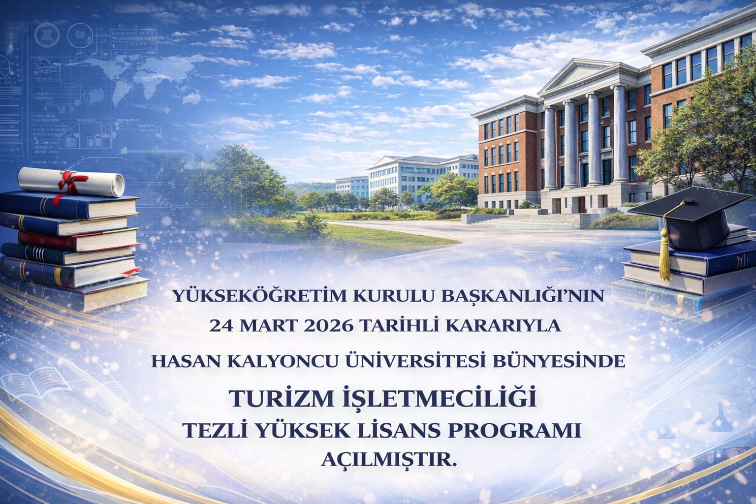 Yükseköğretim Kurulu Başkanlığı’nın 24 Mart 2026 tarihli kararıyla Hasan Kalyoncu Üniversitesi bünyesinde Turizm İşletmeciliği Tezli Yüksek Lisans Programı açılmıştır. Program, turizm sektöründe nitelikli insan kaynağı yetiştirmeyi ve akademik bilgi ile uygulamayı bütünleştirmeyi hedeflemektedir. Öğrencilere alanında uzman akademik kadro eşliğinde araştırma yapma ve uzmanlaşma imkânı sunulacaktır. Bölgesel ve ulusal turizm gelişimine katkı sağlaması beklenen programın üniversitemize ve sektörümüze hayırlı olmasını temenni ederiz.